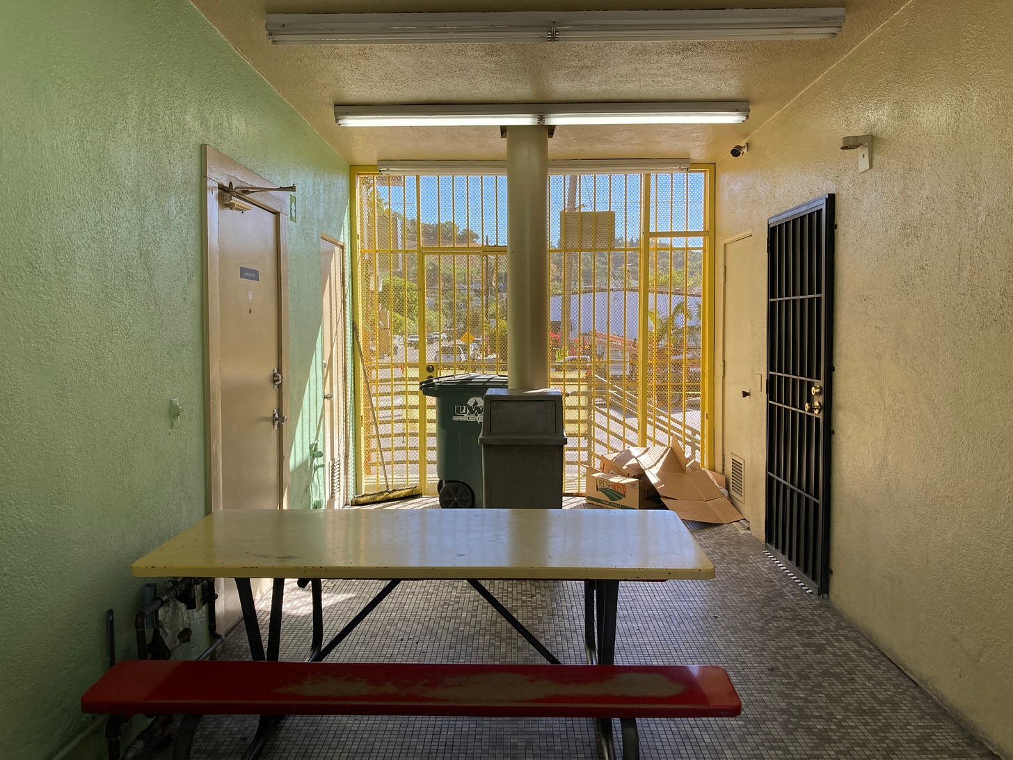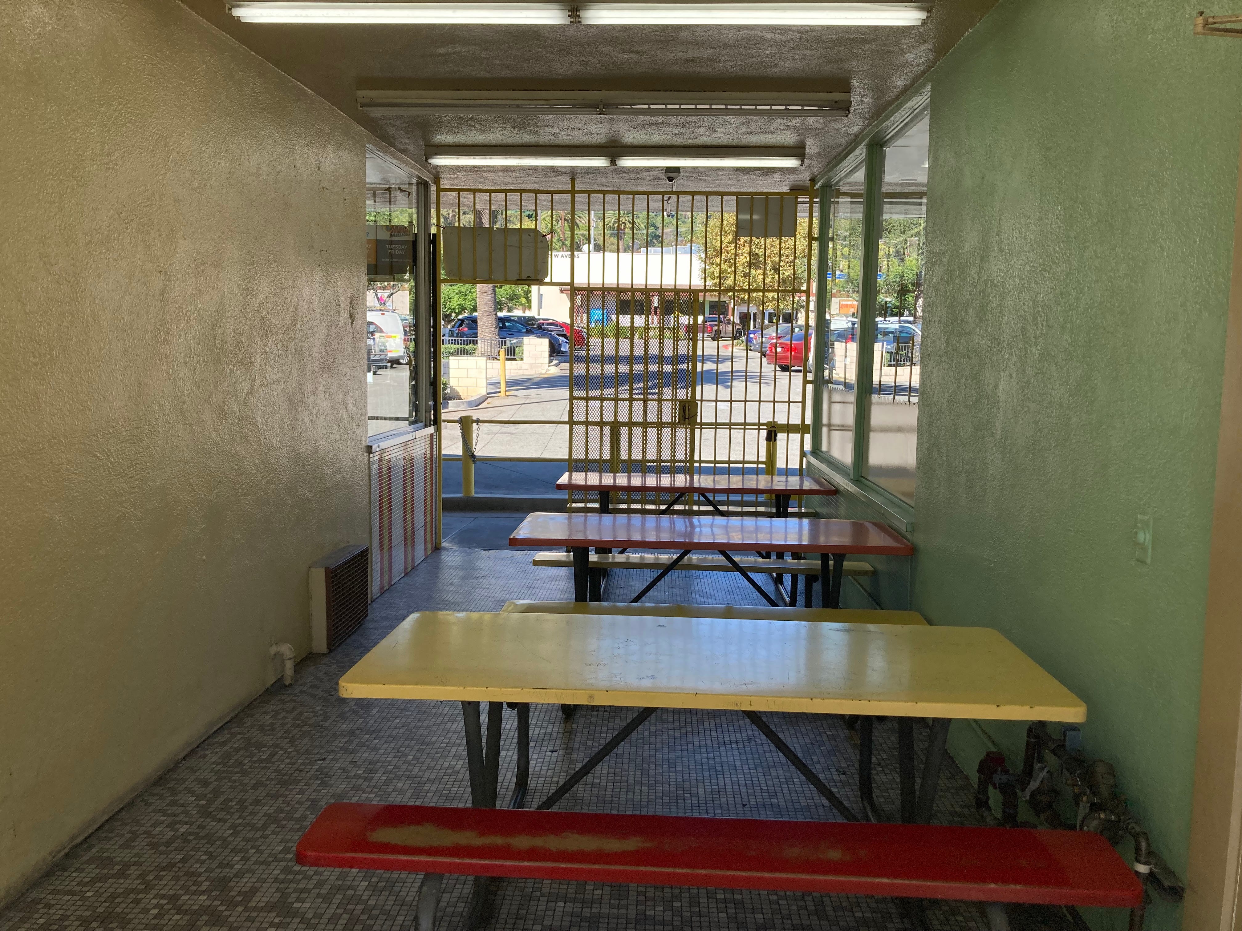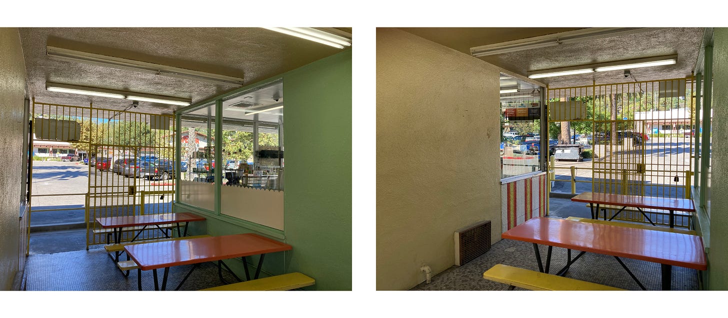 The kiosk building comprises two separate enclosed structures adjoined by a semi-enclosed patio at the center. One of the kiosks is “Taco Fiesta,” a 70s chain restaurant briefly bought and owned by Denny’s.5 This location has been owned and operated by Sam Sirikulbut since 1972. The kiosk to the south attracts a markedly different clientele than the kiosk to the north, connected by an interstitial zone. The interstice is a patio enclosed with a bright yellow painted metal grate, something between a restaurant’s dining patio and a side yard for garbage cans, populated casually with painted metal picnic benches and long communal tables.