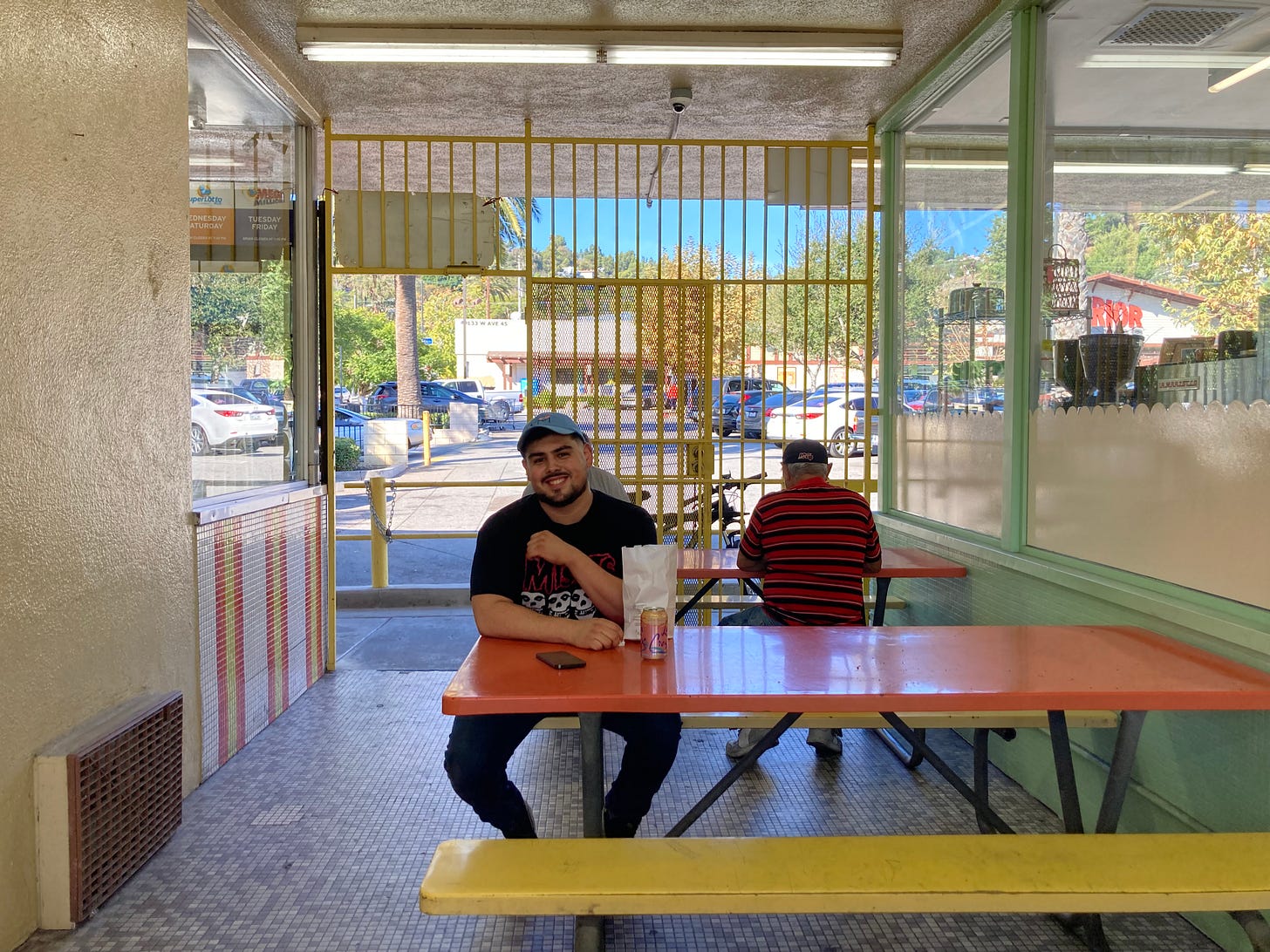 Richard tells me, yeah, some families don’t eat mostly vegan, or gluten-free, so they’ll order at the burrito place next door, but maybe other family members get a bagel from us, and then they all eat together in the patio. Or, some people only come for coffee, and get food next door. Or their customers, referring to Taco Fiesta, will pass by us and just look at the sweets, they’ll come only for the sweets. Richard has lived in Covina, Pomona, but all over California, too, up north in SF, and tells me about having always passed through this neighborhood for decades. It’s constantly changing, you see the subtle changes.