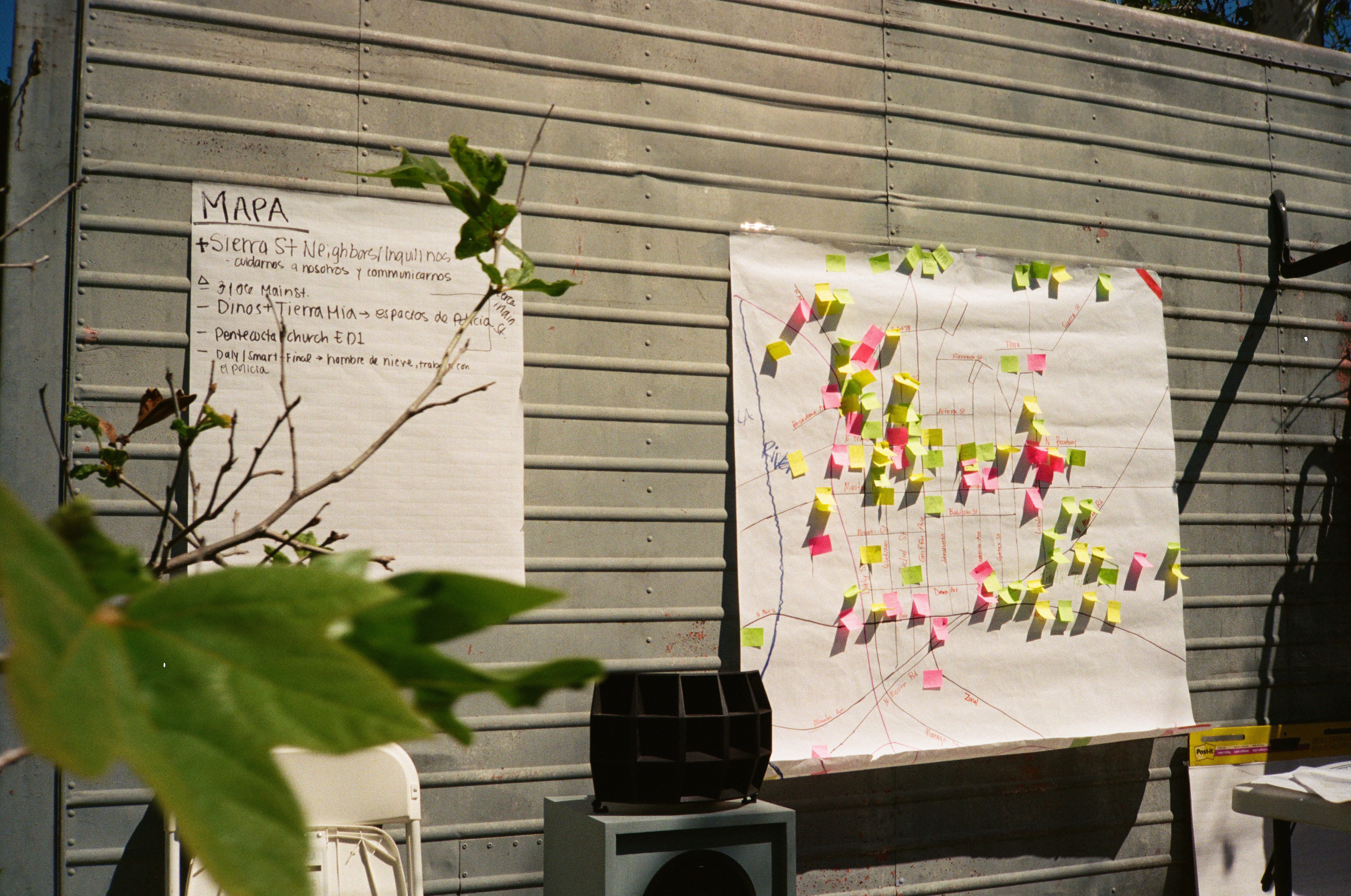 mapping, debating, collaborating, drawing, and making plans with neighbors and comrades of the LA tenant union lincoln heights local (mid-morning meeting immediately following the 1am marathon crash ride—EL, BN, and I biked 45 mi to and from the end of the santa monica pier with other sickos of east LA)