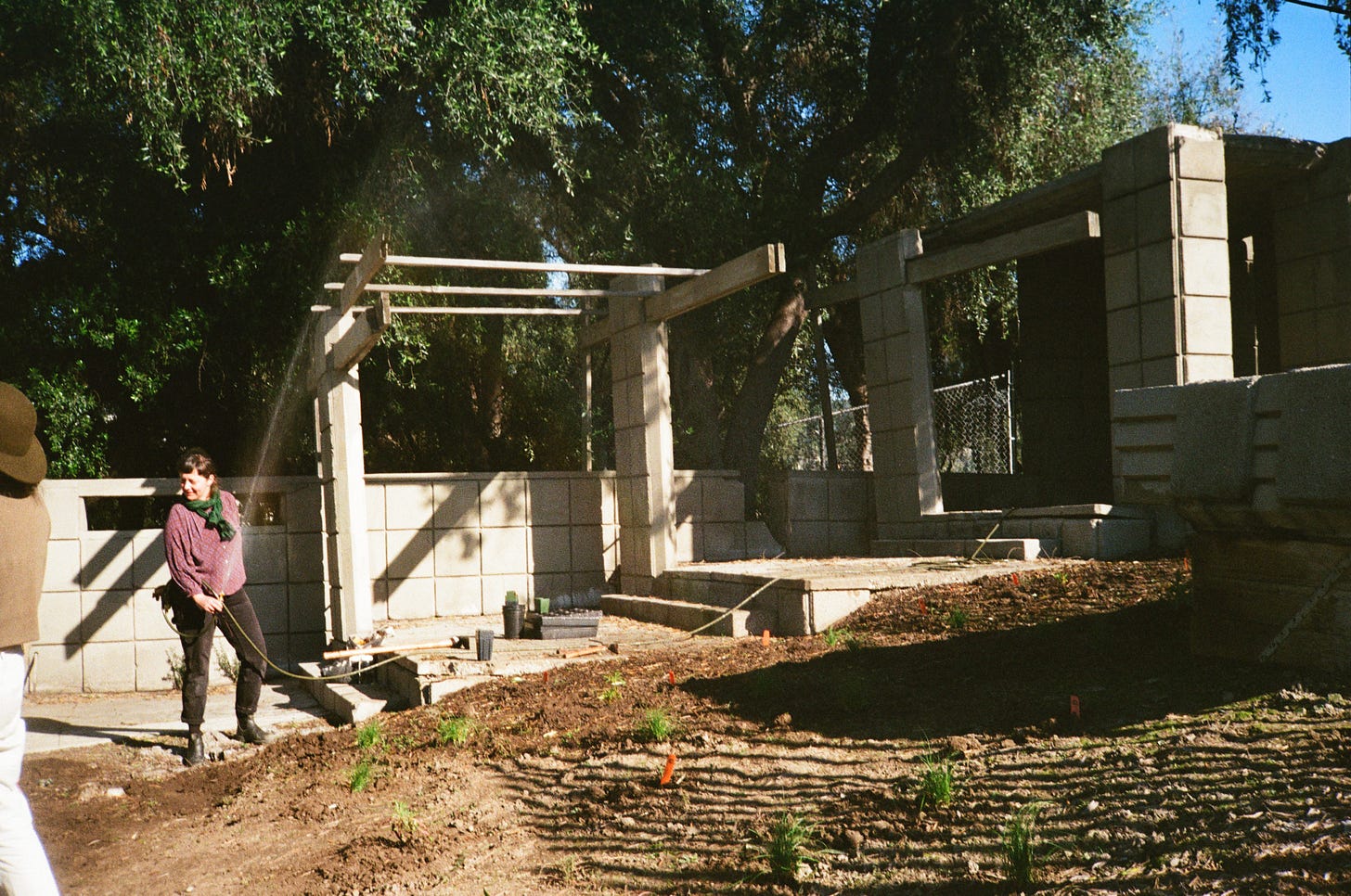 JI watering new seeds planted at test plot, barnsdall /hollyhock house